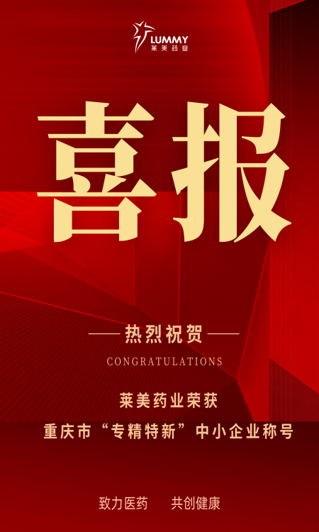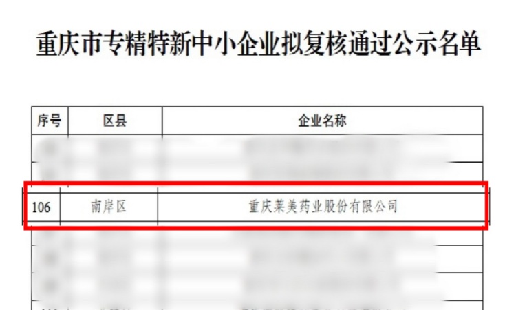 2023年12月18日,由重慶市經(jīng)濟(jì)和信息化委員會(huì)發(fā)布的《關(guān)于重慶市專精特新中小企業(yè)擬復(fù)核通過名單的公示》已結(jié)束公示,萊美藥業(yè)榮獲重慶市“專精特新”中小企業(yè)榮譽(yù)稱號(hào)。