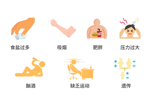 高鈉低鉀膳食、超重和肥胖、吸煙、過量飲酒、社會心理因素、高齡等是高血壓發(fā)病的常見危險因素。除此之外,空氣污染、高海拔、高血壓家族史、缺乏體力活動等也會影響高血壓的發(fā)病。