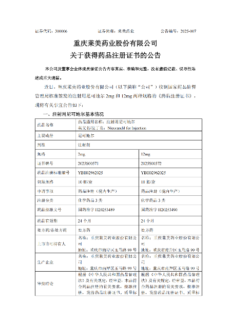 近日,重慶萊美藥業(yè)股份有限公司(以下簡稱“公司”)收到國家藥品監(jiān)督管理局核準(zhǔn)簽發(fā)的注射用尼可地爾 2mg 和 12mg 兩種規(guī)格的《藥品注冊證書》,證書編號:2025S00571、2025S00572。