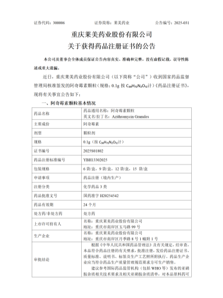 近日,萊美藥業(yè)收到收到國(guó)家藥品監(jiān)督管理局核準(zhǔn)簽發(fā)的阿奇霉素顆粒(規(guī)格:0.1g按C??H??N?O??計(jì))《藥品注冊(cè)證書》,證書編號(hào):2025S01802
