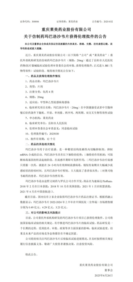 近日,萊美藥業(yè)委托外部機(jī)構(gòu)研發(fā)的仿制藥瑪巴洛沙韋片(注冊分類:化藥4類;規(guī)格:20mg)通過了岳陽市人民醫(yī)院藥物/醫(yī)療器械臨床試驗(yàn)倫理審查委員會的審批,獲得倫理批件,正式進(jìn)入 BE(生物等效性)試驗(yàn)階段。
