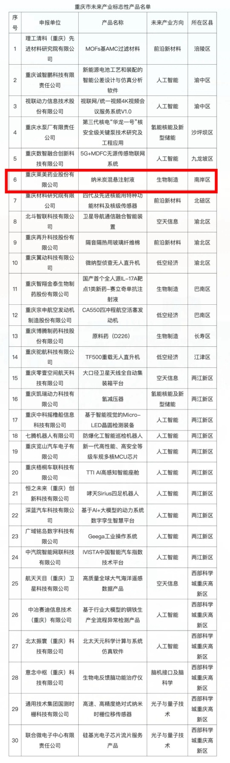 在重慶市經(jīng)信委發(fā)布的這份面向未來的產(chǎn)品名單中,萊美藥業(yè)的納米炭混懸注射液作為生物制造領(lǐng)域的核心技術(shù)產(chǎn)品,躋身重慶市首批30個未來產(chǎn)業(yè)標志性產(chǎn)品之列。該名單聚焦前沿新材料、人工智能、生物制造、低空經(jīng)濟等九大未來產(chǎn)業(yè)方向,代表了重慶產(chǎn)業(yè)升級的核心突破點。